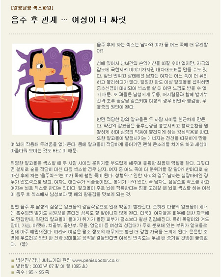 Àû´çÇÑ ¾ËÄÚ¿ÃÀº ¼½½ºÇÒ ¶§ µÎ »ç¶÷ »çÀÌÀÇ ºÐÀ§±â¸¦ ºÎµå·´°Ô ÇØÁÖ¸ç ÈǸ¢ÇÑ ÃÖÀ½Á¦ ¿ªÇÒÀ» ÇÑ´Ù. ±×·¸´Ù¸é ½ÇÁ¦·Î ¼úÀ» Àû´çÈ÷ ¸¶½Å ´ÙÀ½ ¼½½ºÇÒ °æ¿ì ³²ÀÚ, ¿©ÀÚ Áß ¾î´À ÂÊÀÌ ´õ ºÐÀ§±â¸¦ Àß Å»±î? ÇѸ¶µð·Î ¼ú ¸¶½Å ÈÄ¿¡ ÇÏ´Â ¡®À½ÁÖ¼½½º¡¯´Â ¿©ÀÚ ÂÊ¿¡ ÈξÀ µæÀÌ µÈ´Ù. ¼ºÇàÀ§·Î ÀÎÇÑ »ç°íÀÇ °æ¿ì ³²ÀÚ´Â ½ÉÀ帶ºñÀÎ °æ¿ì°¡ ¾ÐµµÀûÀ¸·Î ¸¹°í, ¿©ÀÚ´Â ´ë´Ù¼ö°¡ ³úÁ¹ÁßÀ̶ó´Â Åë°è°¡ ³ª¿Í ÀÖ´Ù. Áï ³²ÀÚ´Â ½ÉÀåÀ¸·Î ¼½½º¸¦ ÇÏ°í ¿©ÀÚ´Â ³ú·Î ¼½½º¸¦ ÇÑ´Ù´Â Àǹ̴Ù. ¾ËÄÚ¿ÃÀÌ ÁÖ·Î ³ú¿¡ ÀÛ¿ëÇÑ´Ù´Â Á¡À» °í·ÁÇÒ ¶§ ³ú·Î ¼½½º¸¦ ÇÏ´Â ¿©¼ºÀÌ À½ÁÖ ÈÄ ¼½½º¿¡¼ ³²¼ºº¸´Ù ¸î ¹èÀÇ È²È¦°¨À» ¸Àº¸°Ô µÇ´Â °Í.