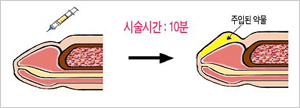 시술 방법 인체에 무해한 특수 성형약물을 표피와 발기조직 사이에 주입 마취 바르는 크림 타입의 마취연고 수술시간 10분 부작용 극히 드물게 나타남 치료기간 시술 후 치료가 필요 없음 일상생활 다음 날부터 바로 샤워가능 성관계 1주일 후부터 가능